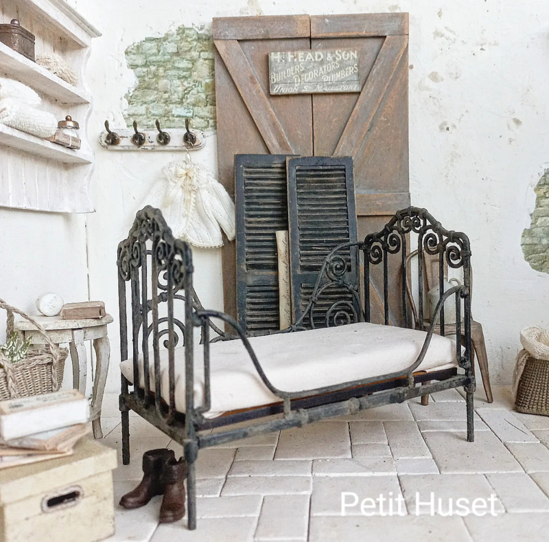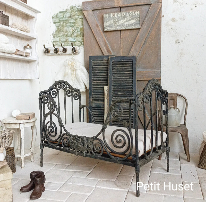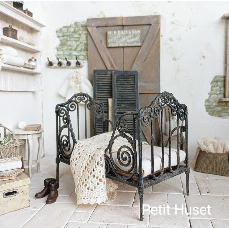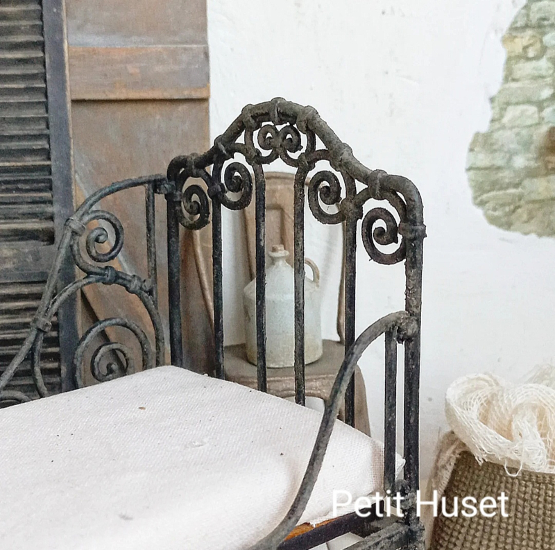 Brocante Kinder Ledikantje met losse bodem en simpel matrasje.